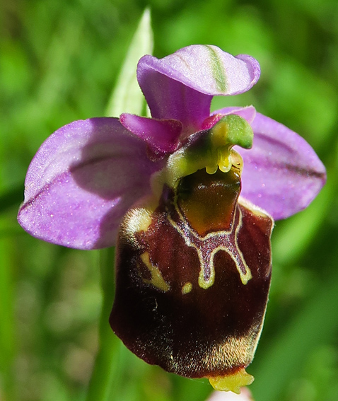 Ophrys fuciflora (Ophrys bourdon) : tige verte ; feuilles inférieures en rosette, les supérieures engainantes ; bractées foliacées ; inflorescence lâche ; grandes fleurs : sépales lancéolés rose plus ou moins foncé, parfois blancs, souvent marqués d'une nervure verte, pétales très petits, triangulaires, de même teinte que les sépales, finement pileux, labelle entier, plus large que long, brun-rouge, gibbosités plus ou moins marquées, macule de forme et de couleur variable, appendice jaune-vert redressé vers l'avant.